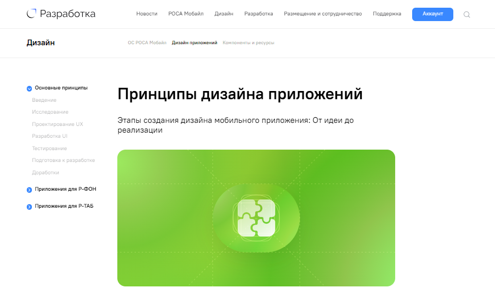 Раздел "Дизайн" содержит рекомендации, методические материалы и визуальные ресурсы, предназначенные для проектирования пользовательских интерфейсов приложений, разрабатываемых под мобильную ОС "РОСА Мобайл" (рисунок 5).