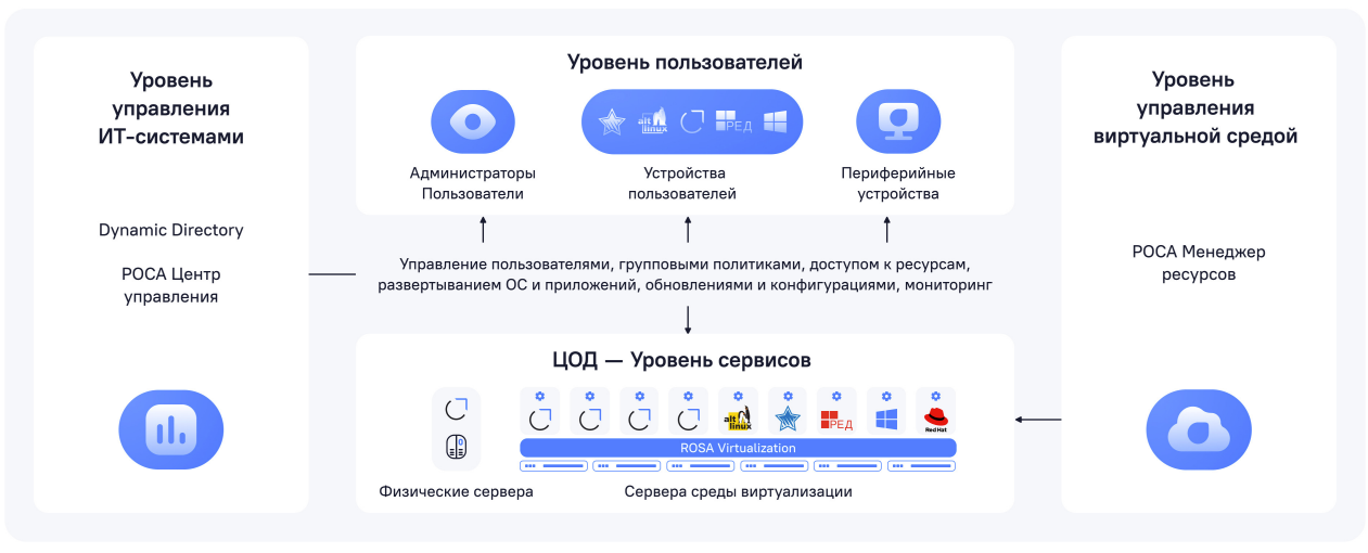 - Уровень управления ‒ для администраторов предусмотрены инструменты, такие как РОСА "Центр управления", Dynamic Directory, РОСА Менеджер ресурсов и РОСА Миграция, которые позволяют управлять всей инфраструктурой — от установки ОС на тысячи рабочих станций до миграции виртуальных машин между серверами .