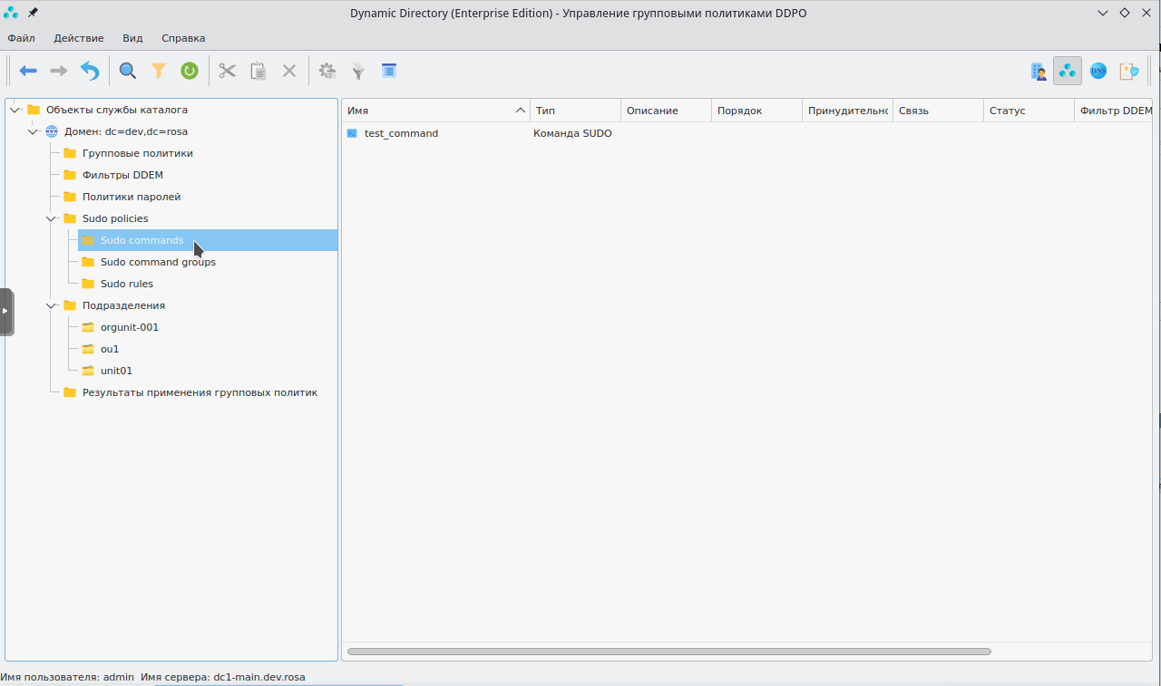 Для доступа ко всем командам sudo необходимо в графическом интерфейсе Dynamic Directory выбрать секцию "Политики sudo" и папку "Команды sudo". В правой панели будут отображены все доступные команды sudo, как показано на рисунке 104.