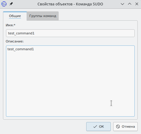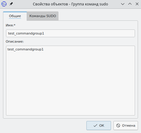 Для изменения информации о группе команд sudo необходимо, находясь в папке "Группы команд sudo", в правой панели вызвать контекстное меню нужной группы команд и выбрать пункт "Свойства", откроется соответствующее окно (рисунок 109).