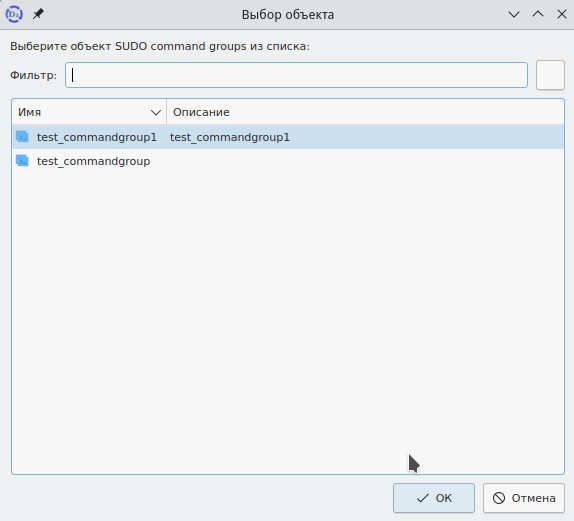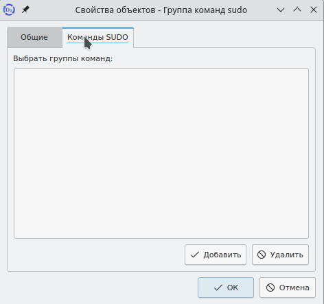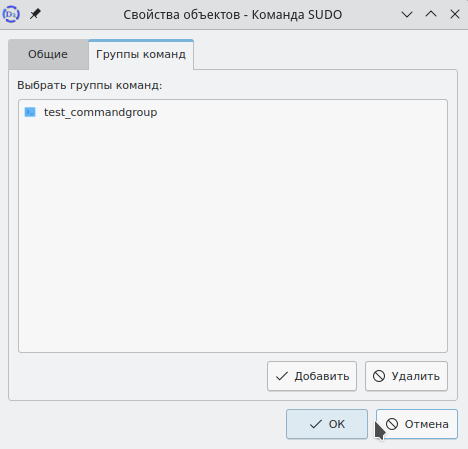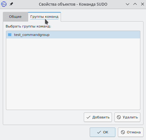 Также объект можно добавить в группу, открыв папку "Группы команд sudo", и выбрав у группы команд sudo с помощью контекстного меню пункт "Свойства". Далее аналогично предыдущим действиям через окно "Выбор объекта" добавить команду в группу.