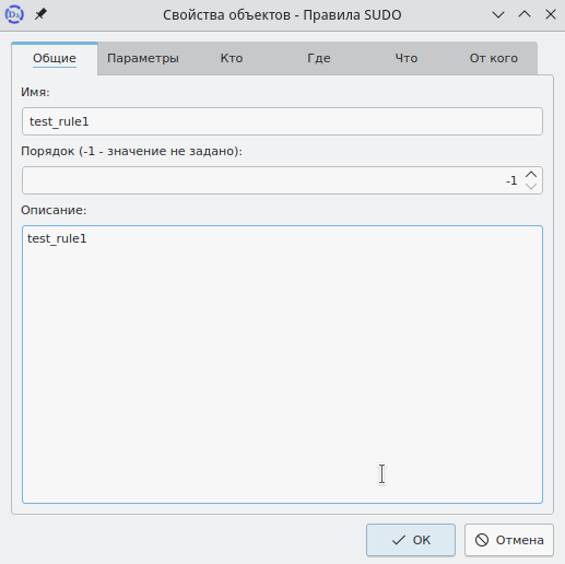 Для изменения информации о правиле sudo необходимо, находясь в папку "Правила sudo", в правой панели вызвать контекстное меню нужного правила и выбрать пункт "Свойства". Будет открыто соответствующее окно (рисунок 114). Во вкладке "Общие" можно изменить порядок применения правила, введя соответствующее значение: чем ниже порядок, тем выше приоритет.