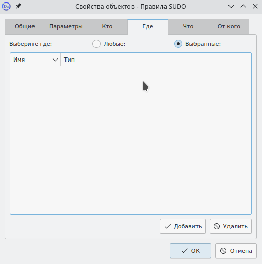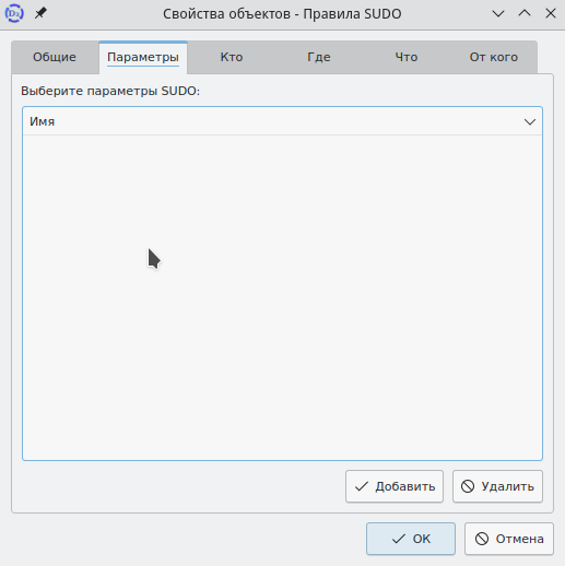 Кроме изменения основных атрибутов правила sudo, в данном окне доступны вкладки "Параметры", "Кто", "Где", "Что" и "От кого".