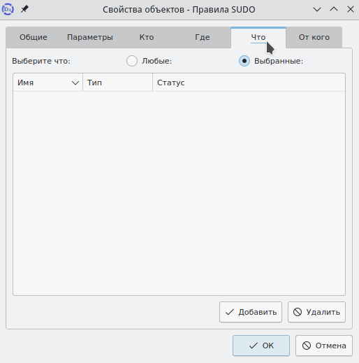При переходе на вкладку "Что" можно назначить команду или группы команд, входящих в правило sudo. Во вкладке доступна дополнительная панель инструментов, на которой отображены кнопки – Добавить и Удалить – для добавления и исключения объектов из правила (рисунок 117).