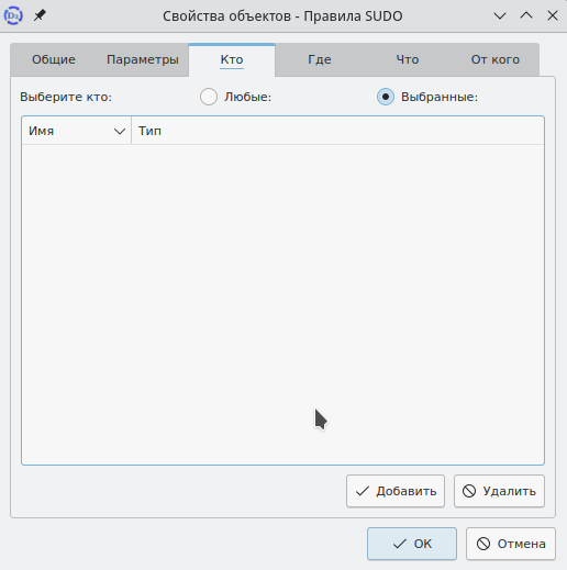 Описание вкладки "Кто" о назначении правил sudo доступно в п. Назначение правил sudo объектам службы каталогов.