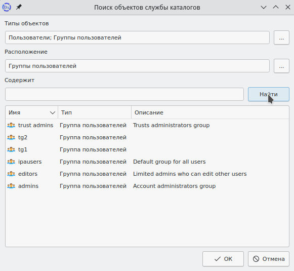 В появившемся окне "Поиск объектов службы каталогов" нужно задать необходимые параметры для поиска, выбрать пользователя, группу пользователей или несколько групп и нажать кнопку ОК в соответствии с рисунком 120. На вкладке "Кто" появится выбранный ранее объект.