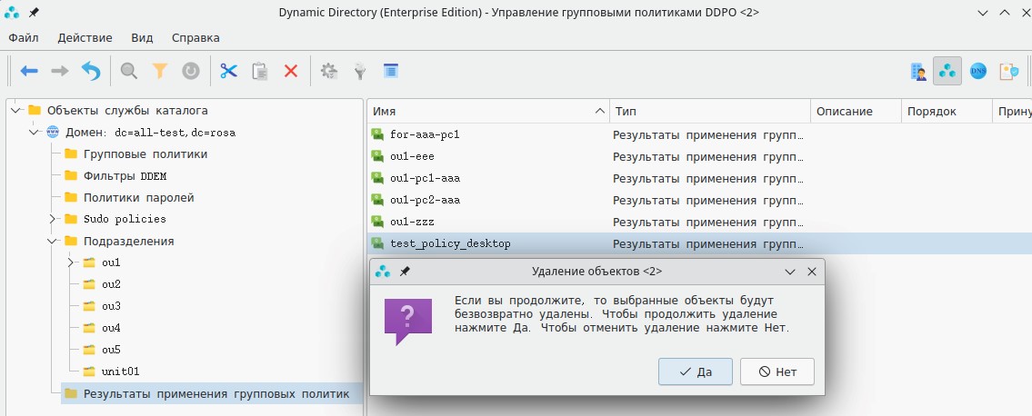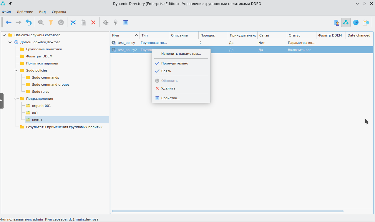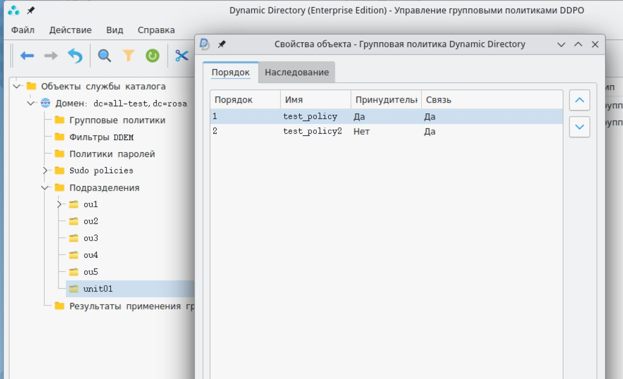 Переопределение порядка применения политик в рамках организационного подразделения осуществляется в графическом интерфейсе Dynamic Directory.