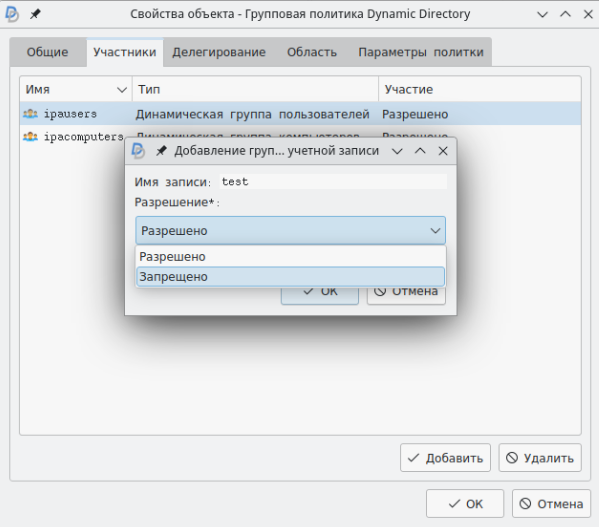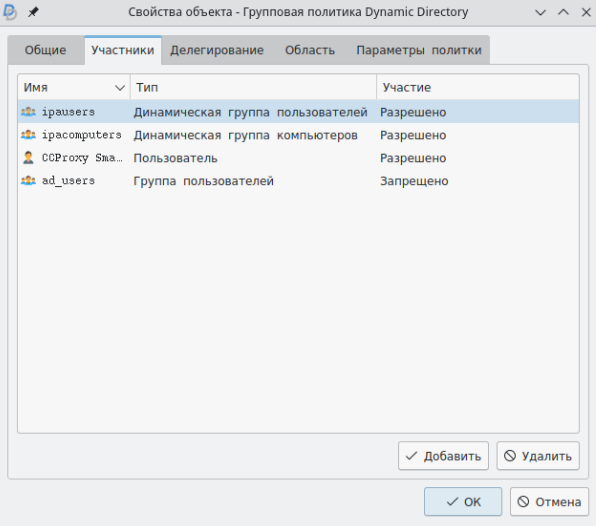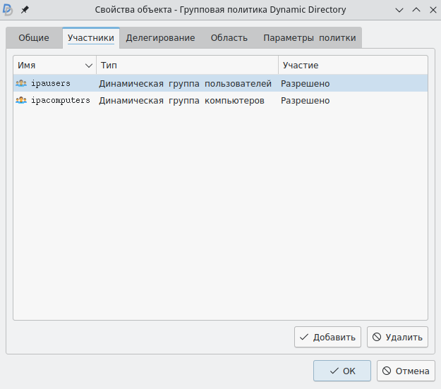 Для проверки разрешения или запрета на применение политики для конкретных пользователей во вкладке "Участники" нужно удалить динамические группы ipausers и ipacomputers.