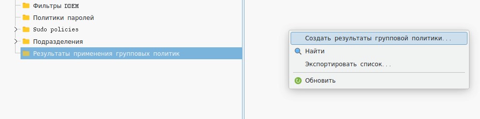 Для моделирования применения групповой политики нужно создать запись в секции "Результаты применения групповых политик", вызвав контекстное меню и выбрав пункт "Создать результаты групповой политики" (рисунок 92).