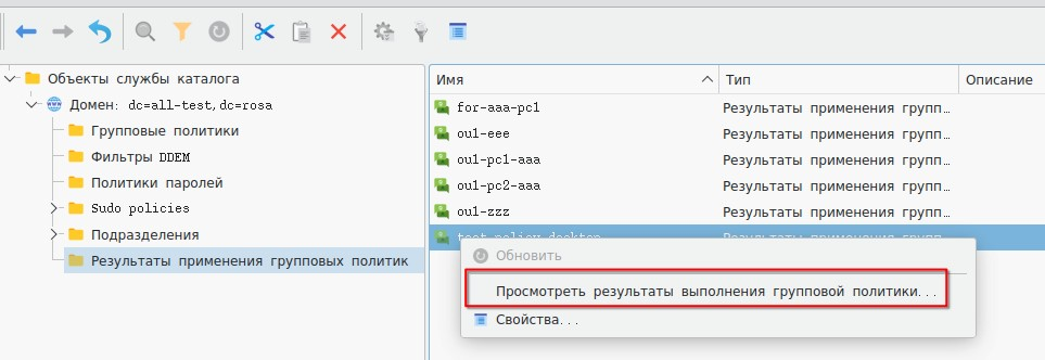 Для просмотра результатов моделирования политики нужно вызвать ее контекстное меню и выбрать пункт "Посмотреть результаты выполнения групповой политики" (рисунок 94).