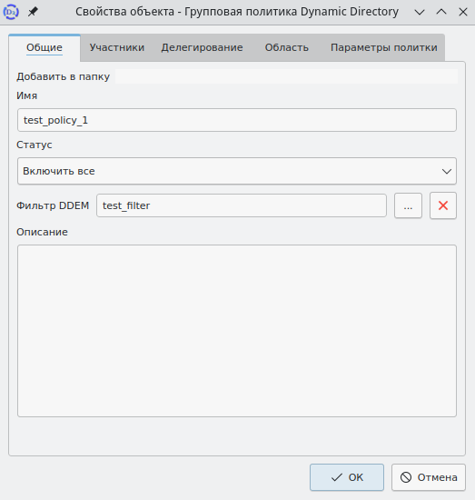 В графическом интерфейсе Dynamic Directory для фильтрации применения политик только к определенным объектам необходимо в главном окне Системы выбрать политику и из контекстного меню – пункт "Свойства". В появившемся окне перейти на вкладку "Общие" и, используя кнопку …, выбрать DDEM-фильтр, который будет применяться к выбранной политике (рисунок 82).