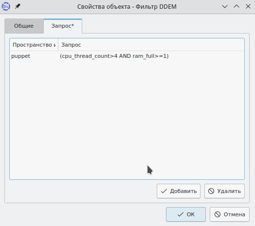Для создания фильтра необходимо нажатием ПКМ на секции "Фильтры DDEM" из контекстного меню выбрать пункт "Создать фильтр DDEM". Далее на вкладке "Общие" ввести имя фильтра и его описание (рисунок 84), затем перейти на вкладку "Запрос" и с помощью кнопок Добавить и Удалить задать выражения для фильтрации при применении политик (рисунок 85). Синтаксис для построения запросов определяется набором параметров, логическими операторами и операторами сравнения.