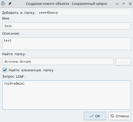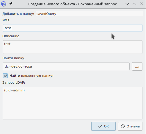 В этом окне необходимо ввести имя, запрос LDAP и, при необходимости, описание. Далее нужно нажать кнопку ОК для сохранения объекта. Окно будет закрыто, в главном окне интерфейса будут отображены данные сохраненного запроса.