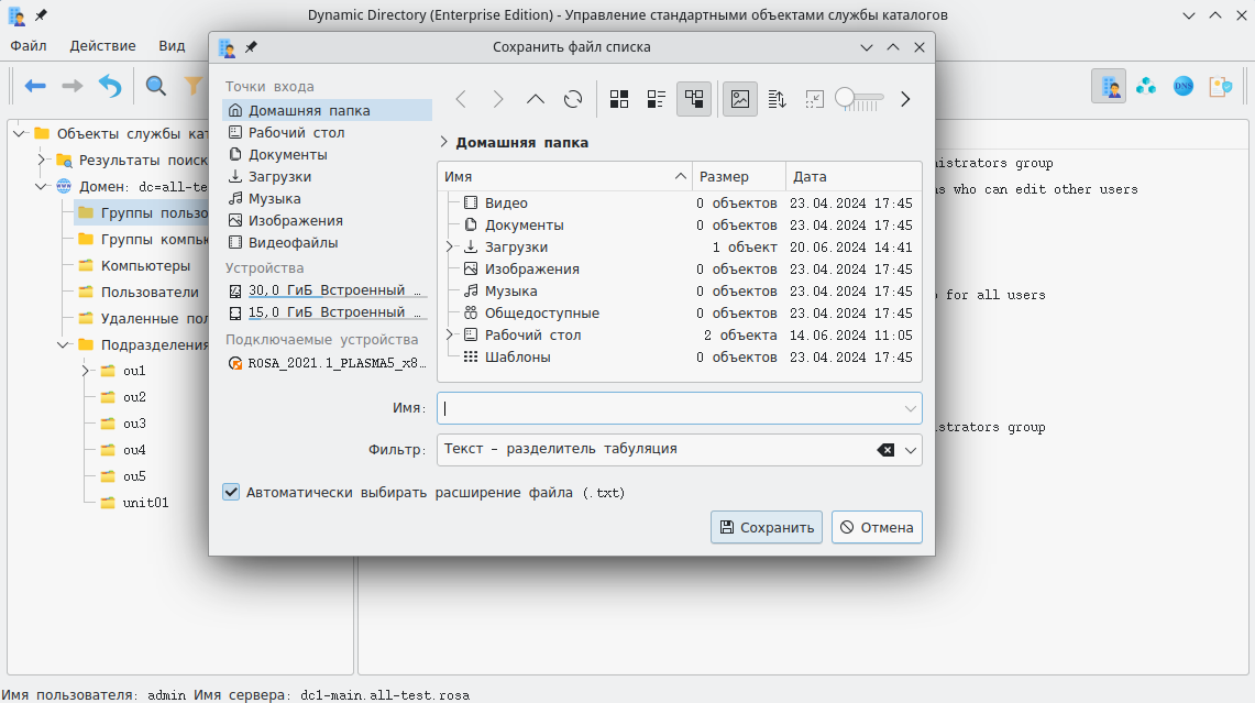 Операция выгрузки списков или результатов поиска доступна в главном окне графического интерфейса Dynamic Directory.