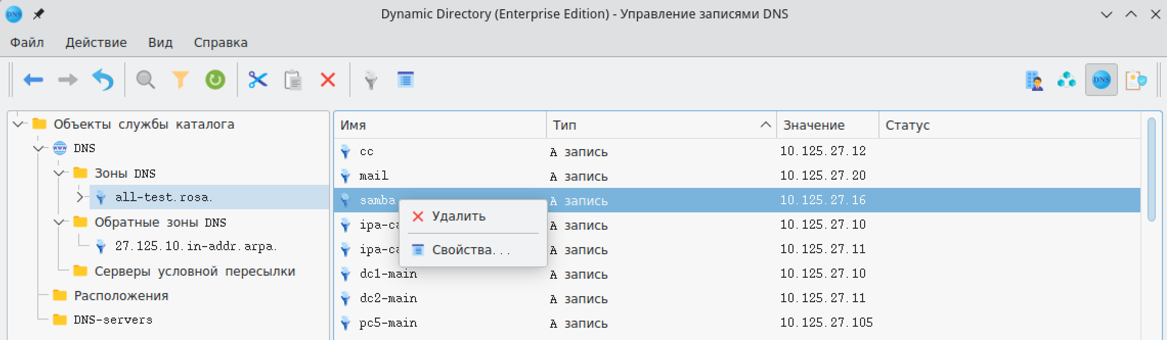 В графическом интерфейсе Dynamic Directory для доступа ко всем записям DNS необходимо выбрать секцию "Зоны DNS", далее в ней выбрать соответствующую зону. В правой панели будут отображены все доступные записи DNS, как показано на рисунке 166.