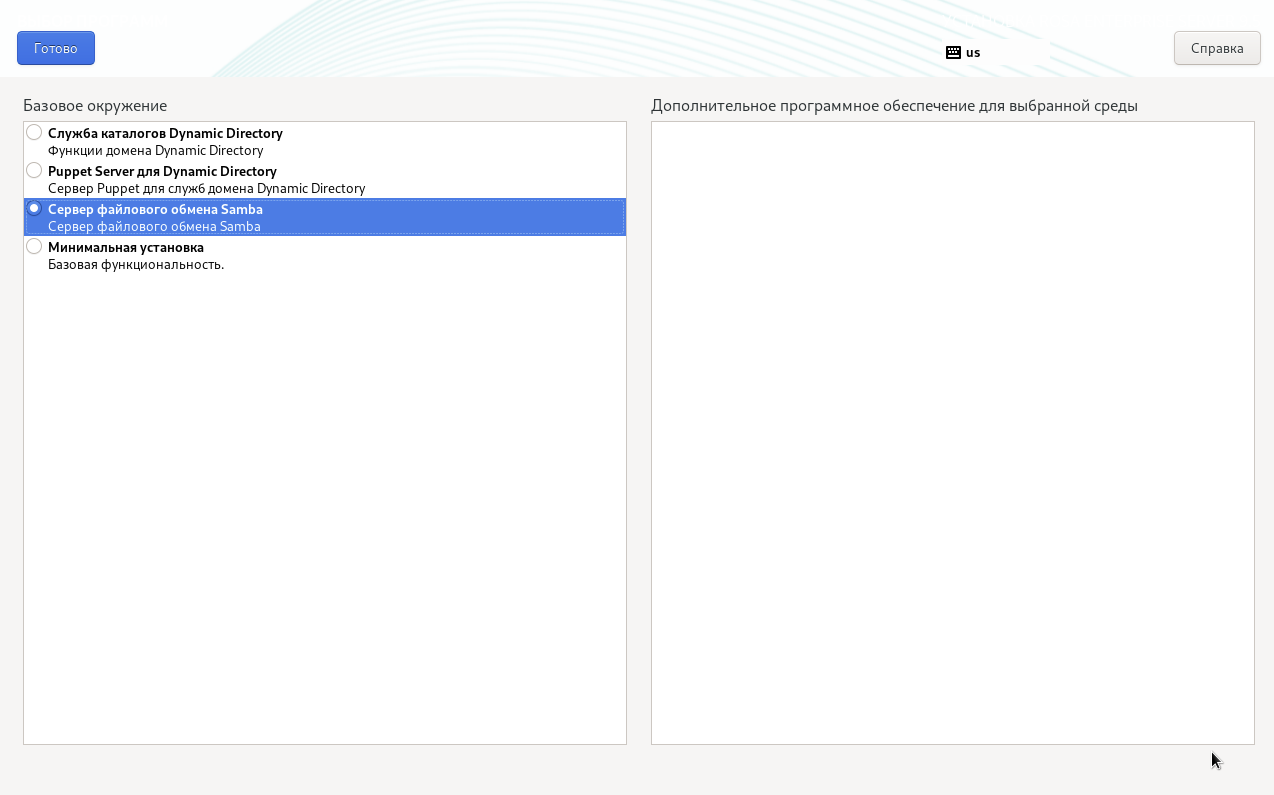 В секции "Выбор программ" устанавливают переключатель "Базовое окружение" в положение "Сервер файлового обмена Samba" для установки соответствующего базового ПО на сервер файлового обмена (рисунок 10).