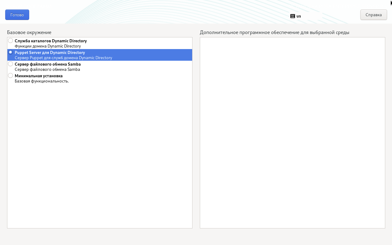 В секции "Выбор программ" нужно указать переключатель "Базовое окружение" в положение "Puppet Server для Dynamic Directory" для установки соответствующего базового ПО на сервер и нажать кнопку Готово (рисунок 6) для возвращения в меню "Обзор установки".