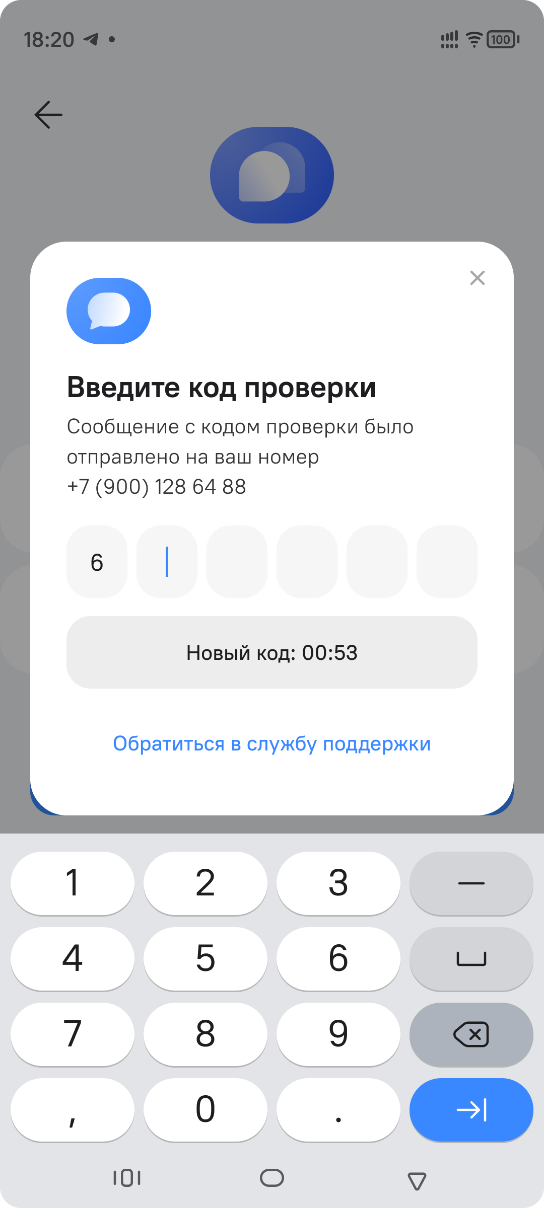 При отсутствии сообщения с кодом подтверждения предусмотрена возможность повторного запроса кода по истечении установленного времени ожидания. В случае возникновения проблем следует обратиться в службу поддержки по нажатию на соответствующую кнопку.