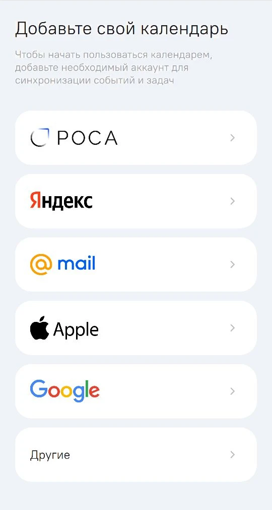 Для синхронизации календаря нужно в приложении добавить учётные записи в зависимости от выбранных сервисов для синхронизации (рисунок 5).