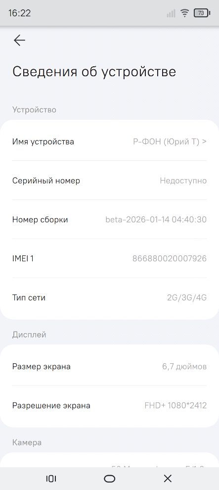 - версия ОС "РОСА Мобайл" и кнопка Обновление ПО для проверки и установки обновлений;