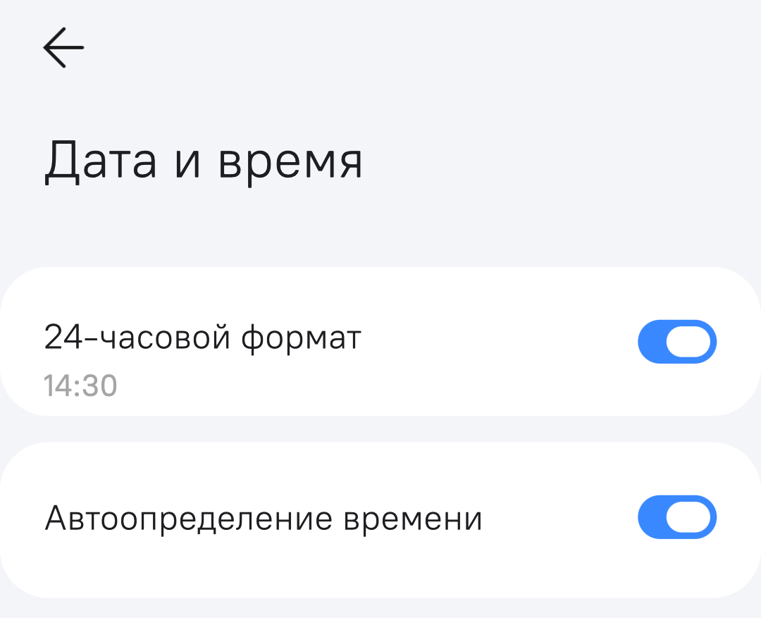 Настройка формата отображения и способа управления временем проводится в разделе "Дата и время" (рисунок 65).