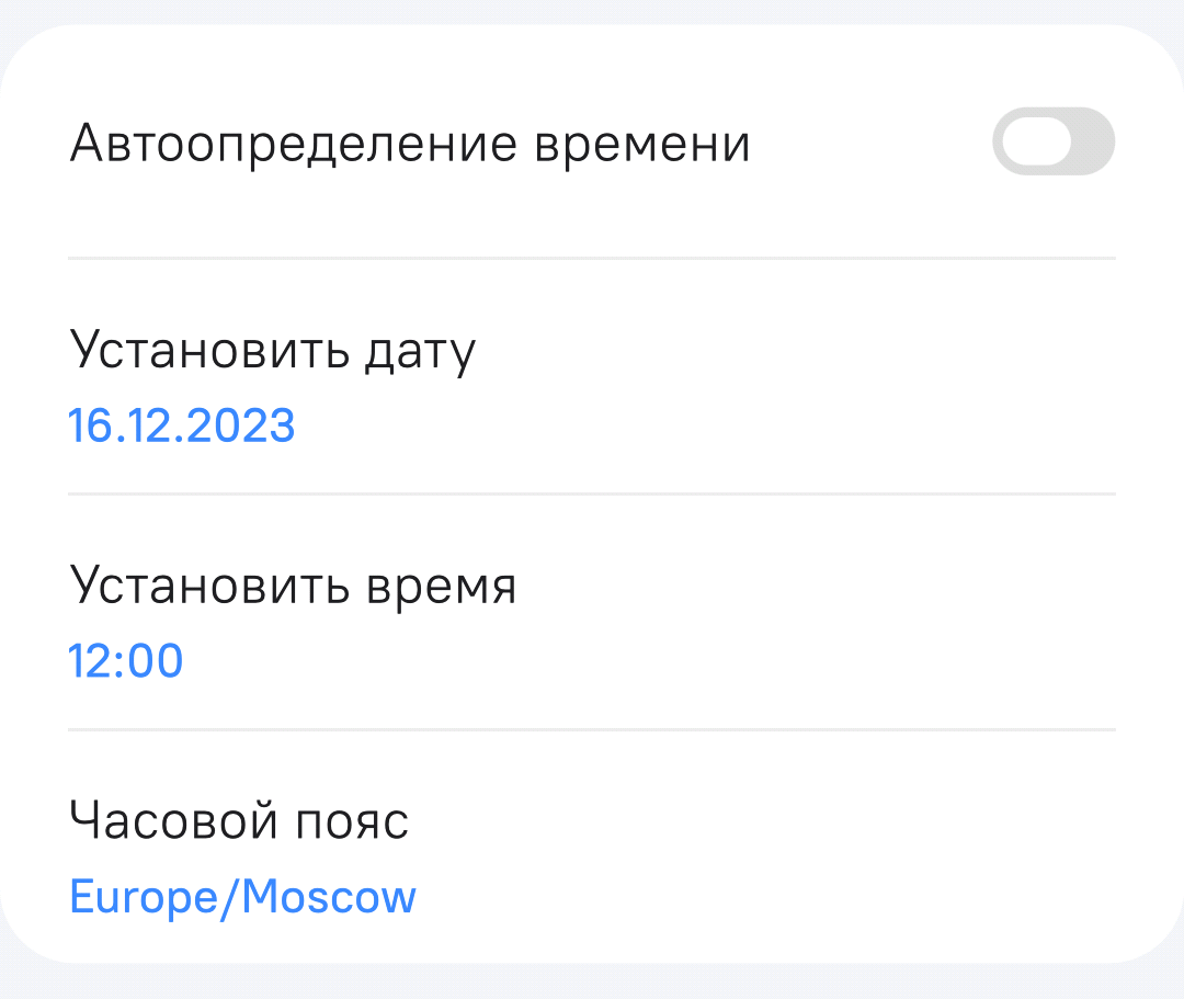 Настройка "Автоопределение времени" позволяет МУ определять время автоматически или выставить дату и время в ручном формате. В ручном формате (переключатель – в выключенном положении) можно выбрать дату (отображается в формате ДД-ММ-ГГГГ), время и часовой пояс (рисунок 67).