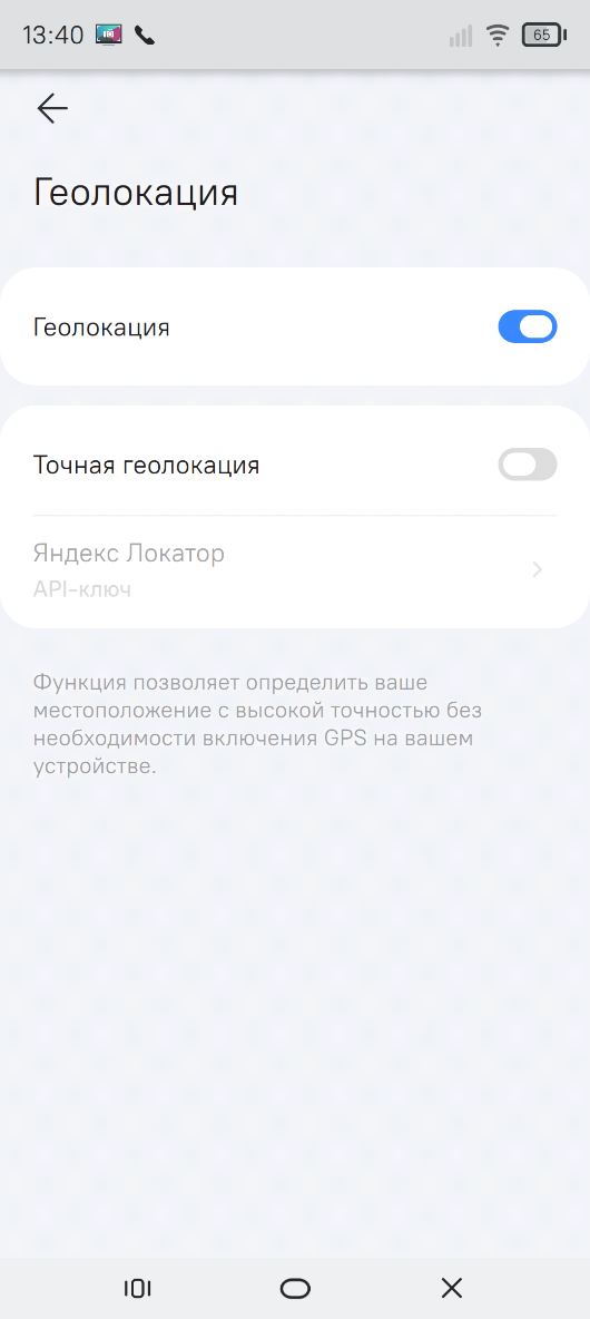 Раздел "Геолокация" предназначен для управления определением местоположения устройства и настройки параметров точности позиционирования (рисунок 64).