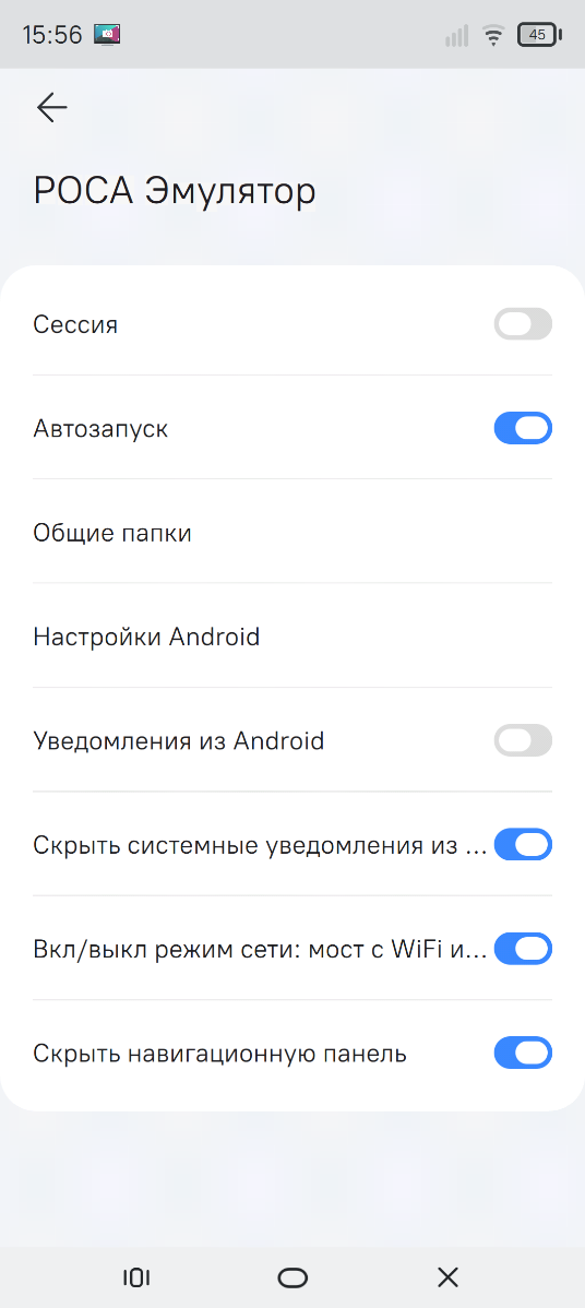 Настройка "РОСА Эмулятор" осуществляется через меню настроек (рисунок 73), включение и отключение также доступно через панель быстрых настроек (шторку уведомлений).