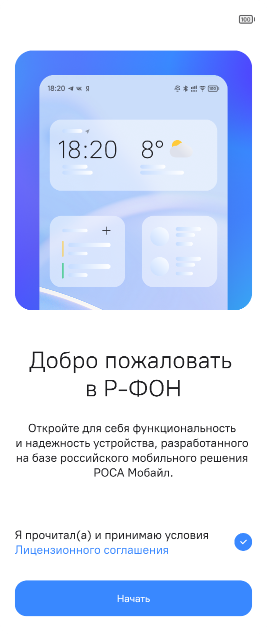 После запуска появится стартовый экран с информацией об ОС и кнопкой Начать. Перед началом настройки следует внимательно ознакомиться с текстом лицензионного соглашения, доступным по соответствующей ссылке. Прочтение необходимо подтвердить установкой флажка. Без принятия условий Лицензионного соглашения переход к дальнейшей настройке невозможен.
