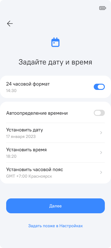 Следующий этап – настройка даты и времени. Настройка включает выбор часового пояса, формата отображения времени и способа определения времени.