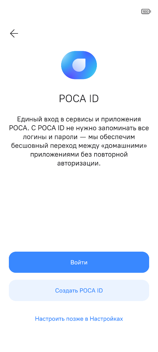 На следующем этапе настройки предлагается зарегистрироваться или войти в учетную запись РОСА ID (рисунок 4). Подробнее о РОСА ID см. п. РОСА ID. Данный этап настройки можно пропустить по кнопке Подключить позже в Настройках и настроить позднее.