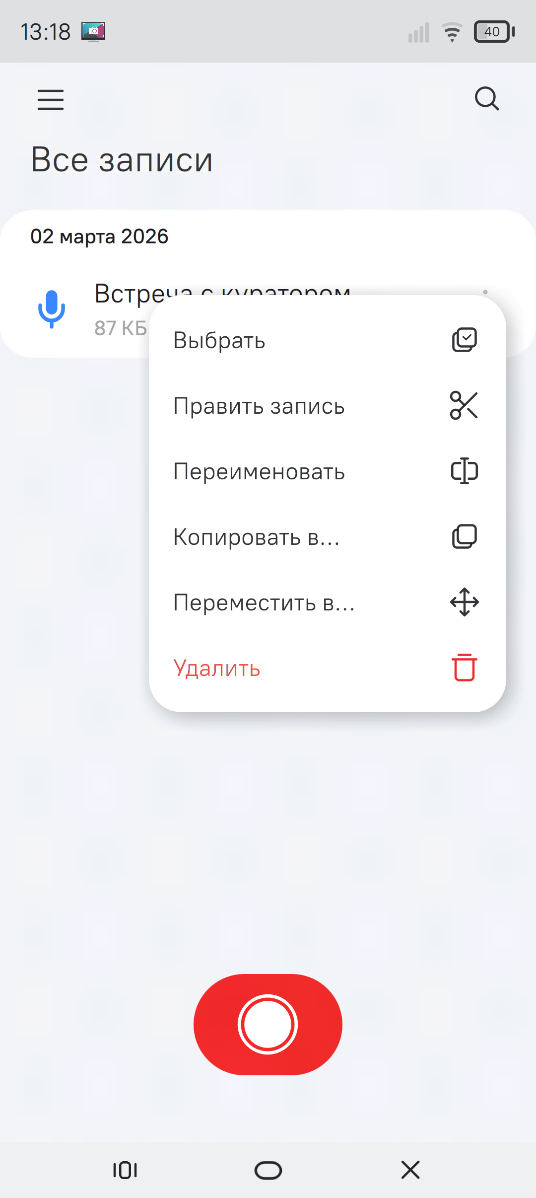 Можно переименовать запись, скопировать или перенести ее в другую папку или удалить. Через пункт "Выбрать" осуществляется переход к множественному выбору записей для выполнения групповых действий.