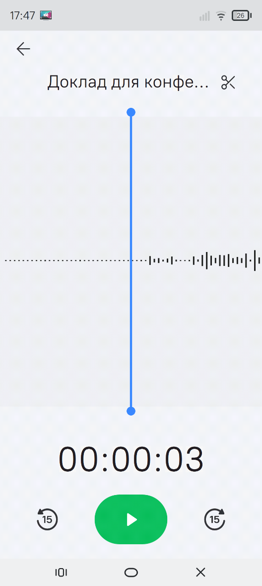 В центре экрана отображается визуальное представление аудиодорожки (волновая форма), синей вертикальной линией отмечена текущая позиция воспроизведения записи.
