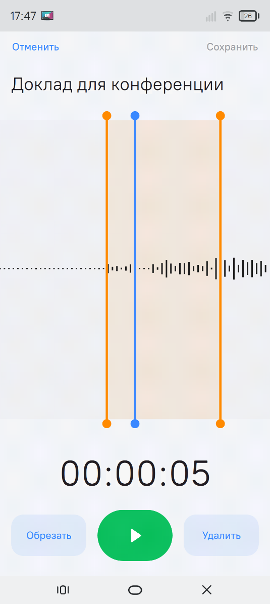 - Обрезать — сохранение записи с учётом выбранного диапазона;