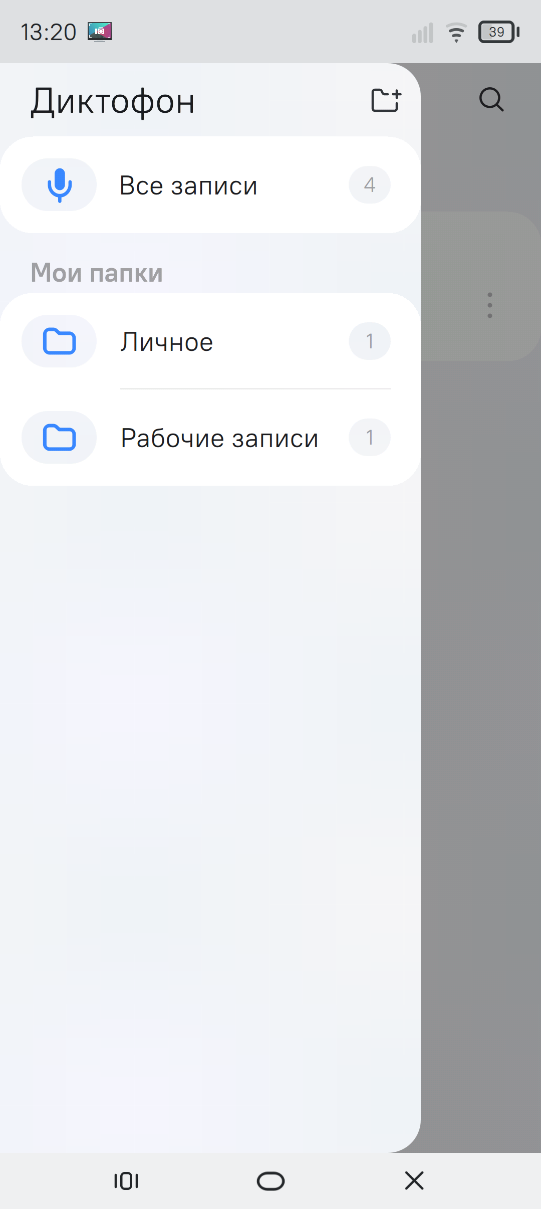 Аудиозаписи в приложении "Диктофон" хранятся в папках. По умолчанию все записи создаются и сохраняются в системной папке "Все записи", но пользователю доступно и создание собственных папок. Пользовательские папки отображаются в секции "Мои папки" (рисунок 172).