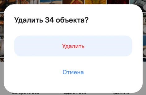 В режиме выбора можно выбрать один или несколько файлов, поделиться ими или удалить. Выбор производится нажатием на выбранный файл, снятие выбора – повторным нажатием на уже выбранный файл. При удалении необходимо дополнительное подтверждение действия (рисунок 101).