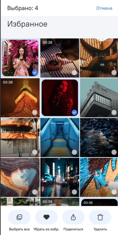 Меню в режиме выбора позволяет выбрать все файлы, удалить из списка избранных, поделиться или удалить из памяти МУ. Выбор производится нажатием на выбранный файл, снятие выбора – повторным нажатием на уже выбранный файл (рисунок 104).