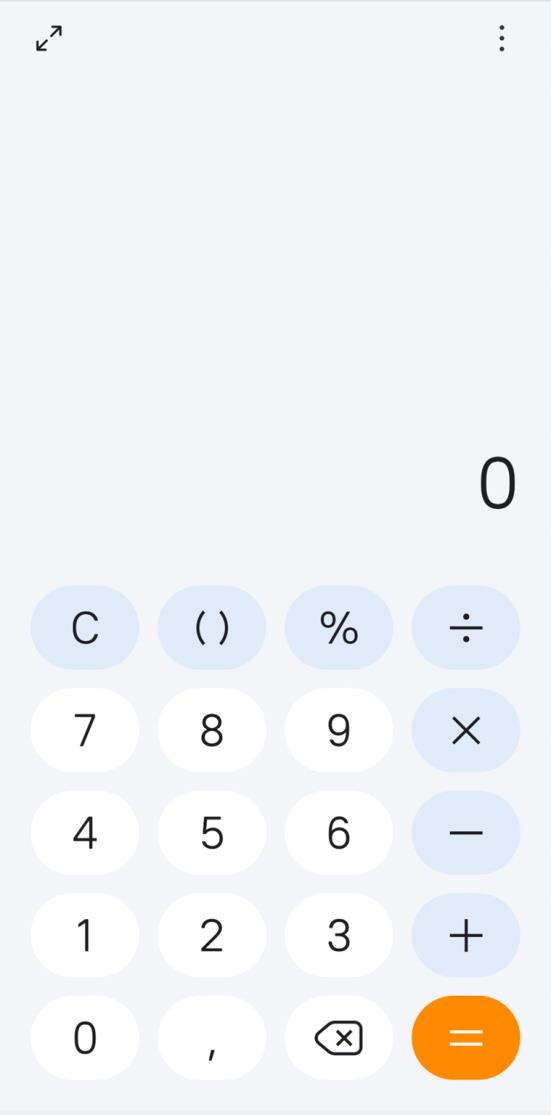 C‒ кнопка сброса последнего выражения;()‒ операция скобок в выражениях;%‒ оператор процента;÷‒ оператор деления;×‒ оператор умножения;−‒ оператор вычитания или использование отрицательного числа;+‒ оператор сложения или использование положительного числа;=– операция вычисления выражения;