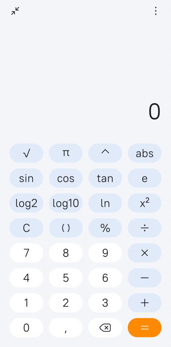 Приложение работает в двух режимах: обычный и расширенный (инженерный). В расширенном режиме дополнительно доступны некоторые функции: корень, число π, степень, модуль, тригонометрические функции и логарифмы. Переключение между режимами производится нажатием кнопок