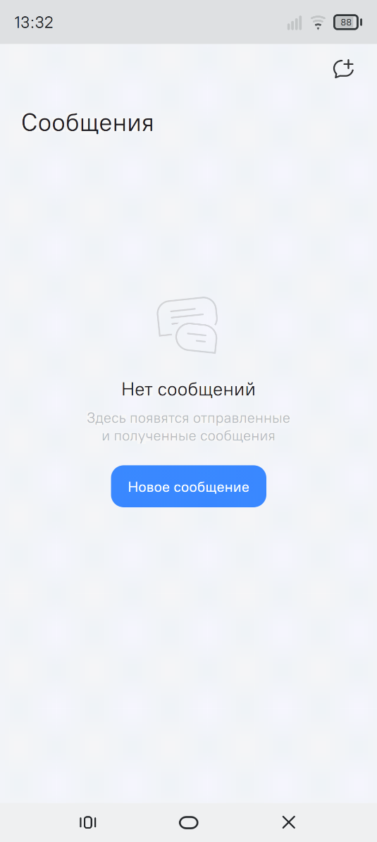 При первом открытии приложения отображается основной экран раздела "Сообщения". Если в МУ отсутствуют сообщения, в центральной части экрана выводится информационное уведомление "Нет сообщений" с пояснением о том, что в данном разделе будут отображаться отправленные и полученные сообщения (рисунок 78).