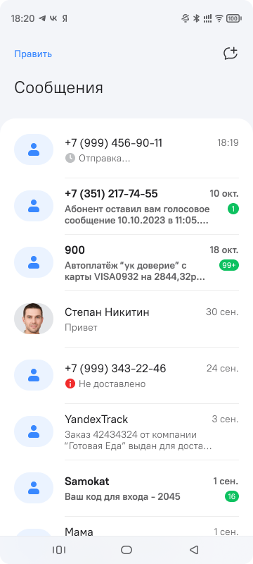 После появления отправленных или полученных сообщений на основном экране приложения "Сообщения" отображается список диалогов (рисунок 79).