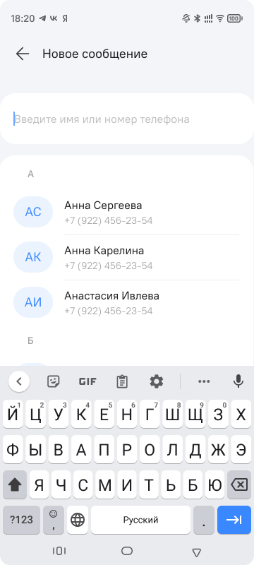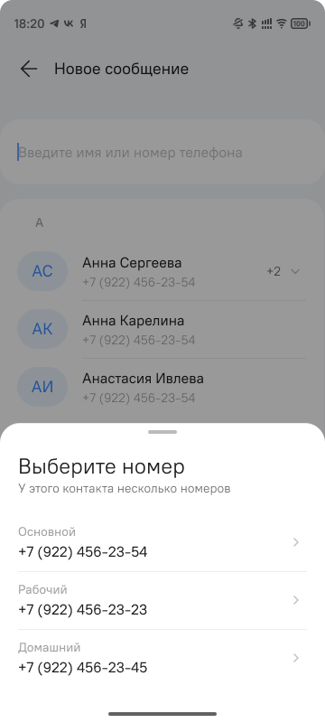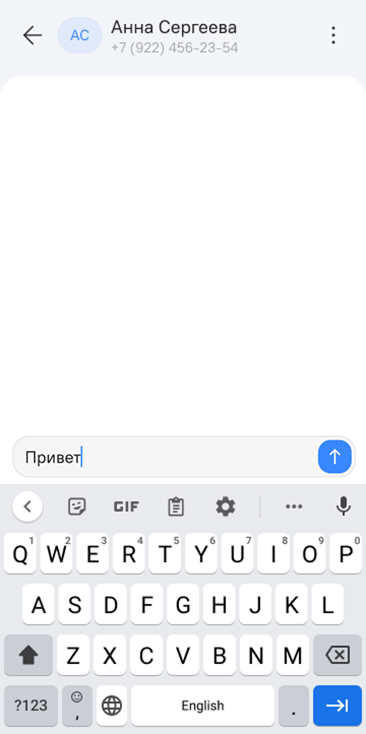 - ввод номера телефона получателя вручную при отсутствии абонента в списке контактов.