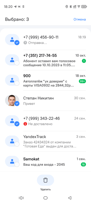 После выбора диалогов в нижней части экрана отобразится кнопка Удалить
