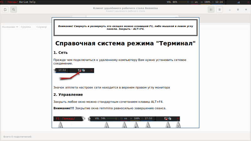 - пользователю доступно только одно приложение — Remmina (клиент удаленного рабочего стола);