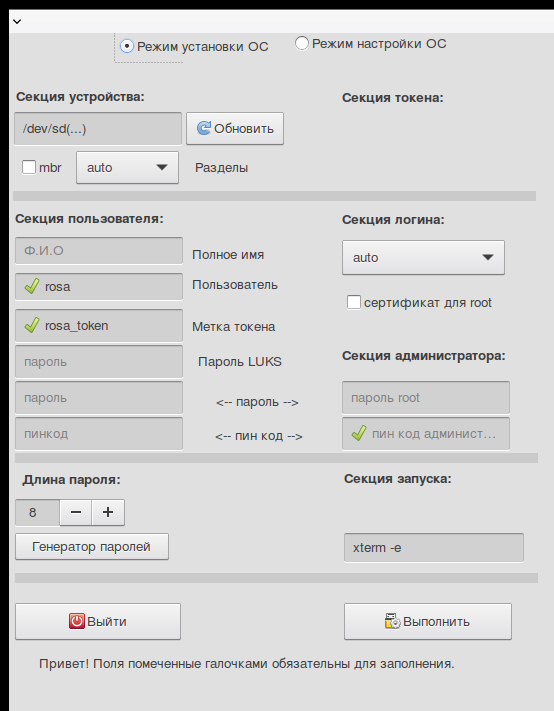 На официальных токенах ОС уже установлена, а первичная настройка выполняется при первом запуске Системы через специальную программу, в которой необходимо заполнить соответствующие поля (рисунок 1).