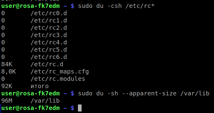 du также позволяет использовать шаблон оболочки. Например, чтобы получить размер всех каталогов из /etc, начинающихся с "rc", нужно выполнить:
