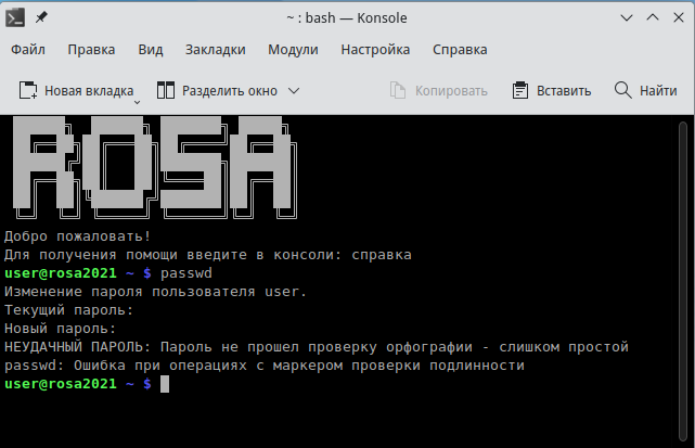 Для смены пароля через терминал в меню приложений нужно найти/выбрать пункт konsole или нажать сочетание клавиш Сtrl+Alt+T. В открывшемся терминальном окне нужно ввести команду passwd и нажать клавишу Enter.