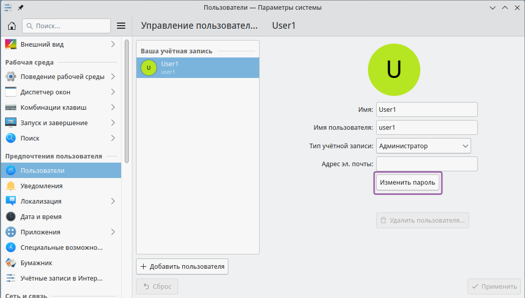 Для смены пароля пользователя через графический интерфейс перейдите в "Параметры системы" → блок "Предпочтения пользователя" → "Пользователи" и далее нажмите на кнопку "Изменить пароль" (Рисунок 30).