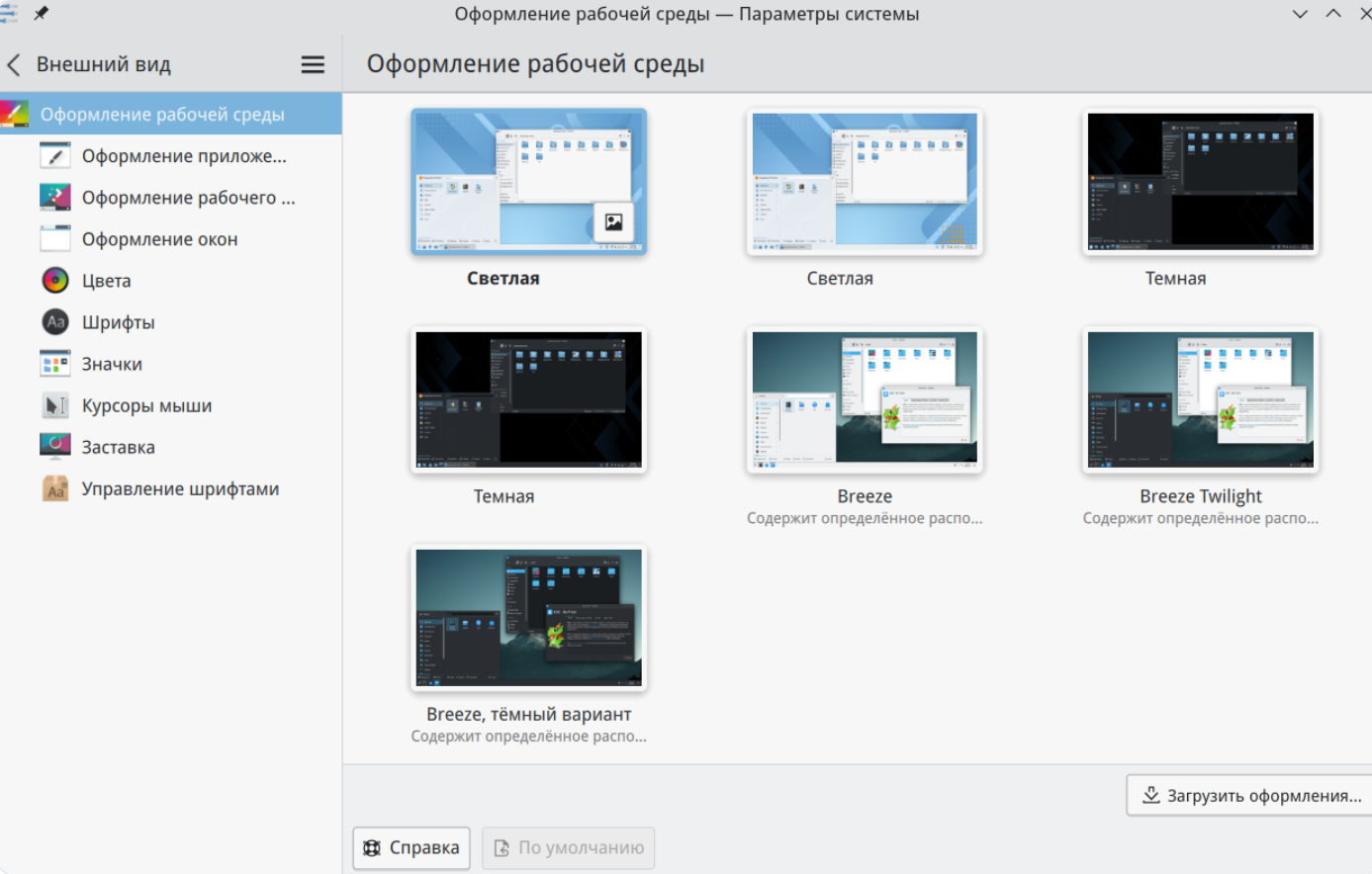 В ОС по умолчанию применено светлое оформление рабочей среды. Для переключения на темное оформление нужно перейти в "Параметры системы" → "Внешний вид" → "Оформление рабочей среды" и выбрать "Темная" (Рисунок 19).