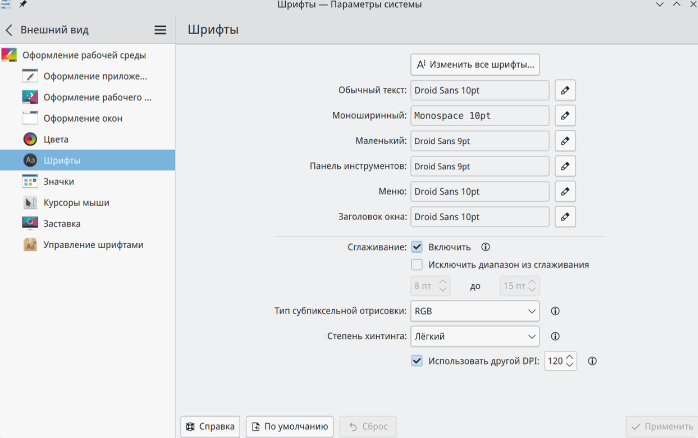 Настроить используемые в интерфейсе шрифты можно в разделе "Внешний вид", для чего открыть "Параметры системы" и выбрать вкладку "Внешний вид" → "Оформление рабочей среды" → Шрифты" (Рисунок 20).